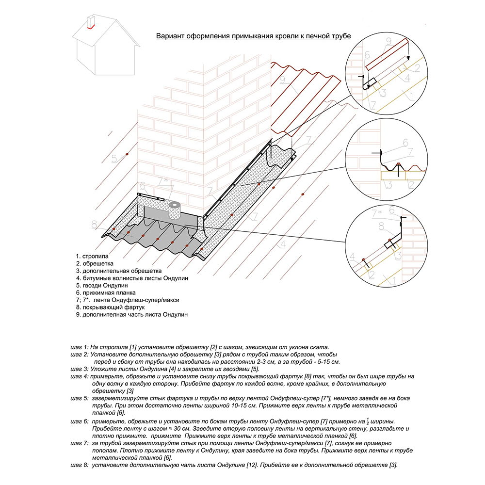 Предназначен для герметизации стыка между кровельными листами ондулин и вертикальной стеной или печной трубой.